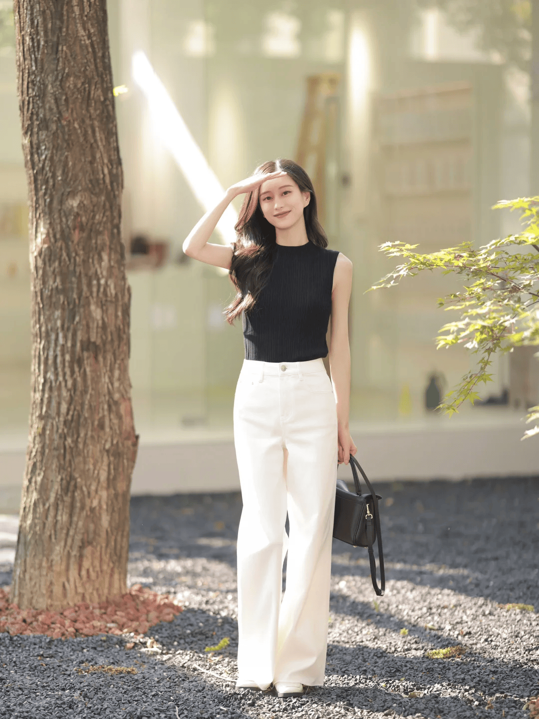 首先,黑色自带视觉收缩效果,初夏季节搭配单品比较少,所以可以更大限度的显瘦,比如黑色无袖针织衫搭配米白色高腰窄版阔腿裤,再拎一只黑色包包。经典黑白配色干净利落,高腰裤拉长腿部比例,露出纤细手臂更显清爽。整体简约又大气,显瘦又显气质,日常穿舒适不挑人,轻松穿出高级感。