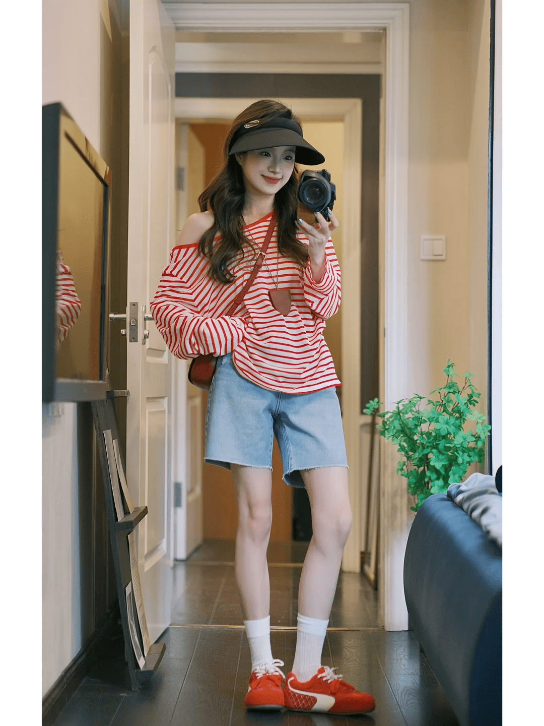 除了版型宽松以外,牛仔短裤的长度也要注意,像这种四分裤的长度就刚刚好,而且那种裤腿毛边设计会显得更加随性有个性,搭配一件宽松的条纹T恤,如果是小个子女生,选择这种露单肩的款式,就不会压个子,反而会显瘦显高。