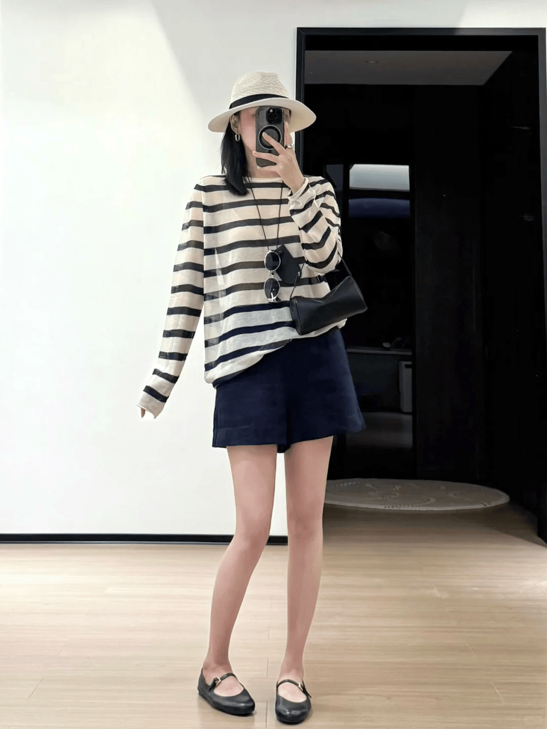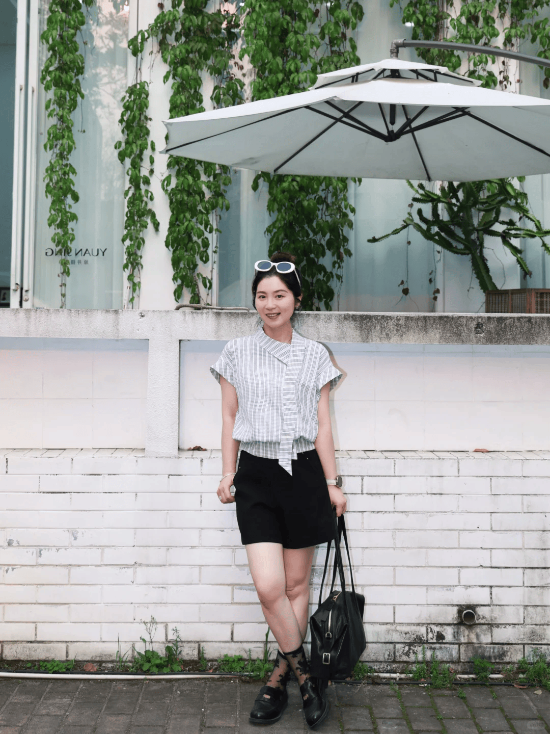 宽松舒适的白色黑条纹罩衫搭配黑色西装短裤,将下摆一角随意塞进裤腰,打造宽松舒适且随性的初夏穿搭,复古又充满高级感,氛围感满满!好了,今天的分享就到这里,我们下期见~