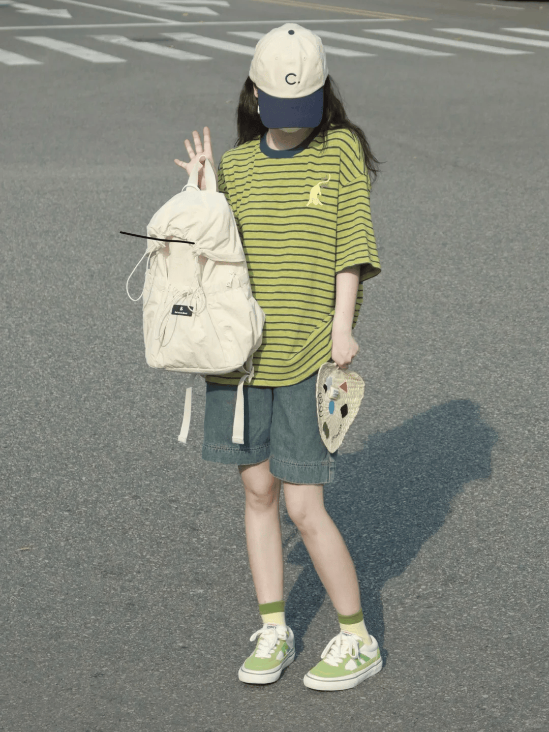 初夏穿搭松弛感也很重要,选择宽松舒适的绿色条纹T恤,搭配宽松的四分牛仔短裤,与T恤同色系的抹茶色平底鞋,卡其色棒球帽和背包,非常的时髦又清新,初夏季节这么穿超级有氛围感哦!