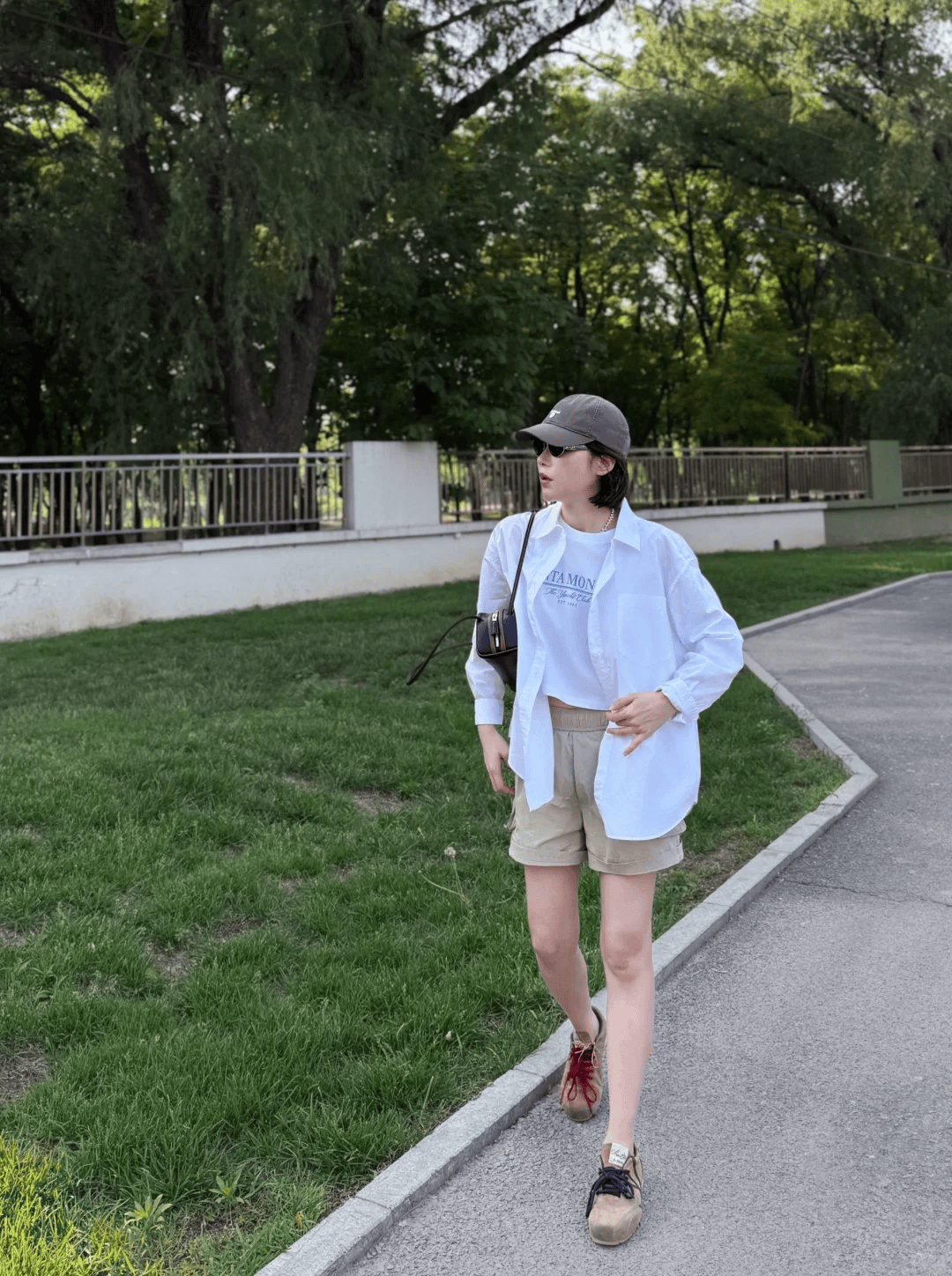 白衬衫随性当作薄外套,内搭白色印花T恤,清爽又有层次感。下身搭配卡其色西装短裤,利落显腿长,同色系卡其色运动鞋呼应整体,简约又协调。整套穿搭休闲不拖沓,干净舒适,初夏出门自在又耐看,轻松穿出日常高级感。