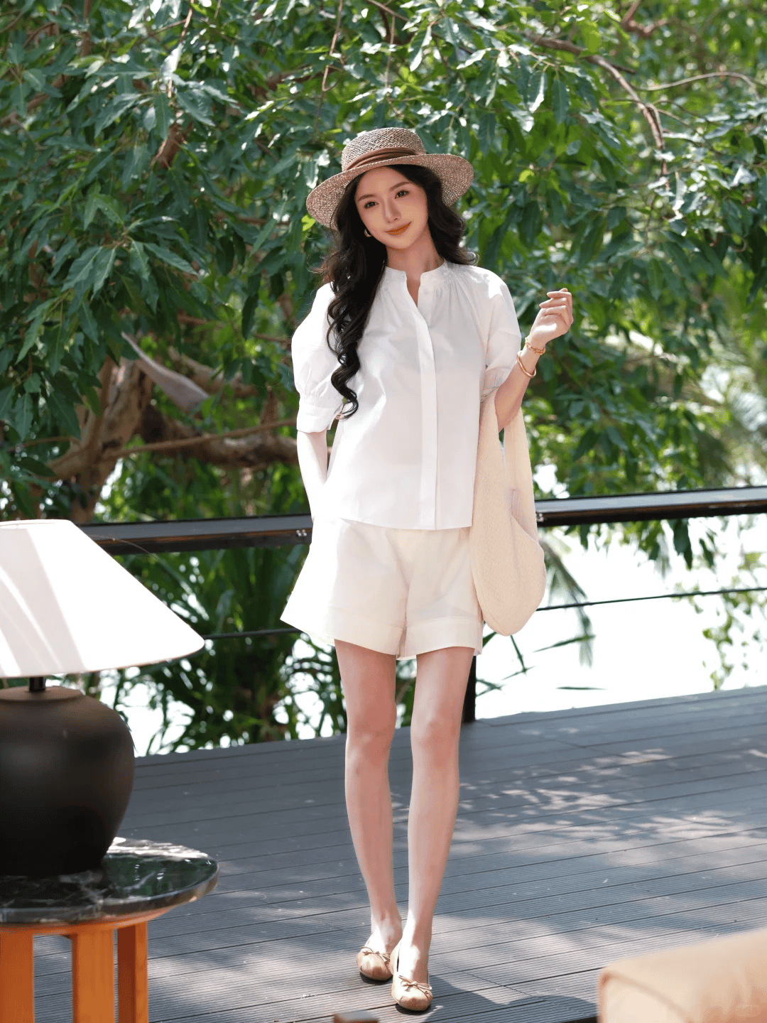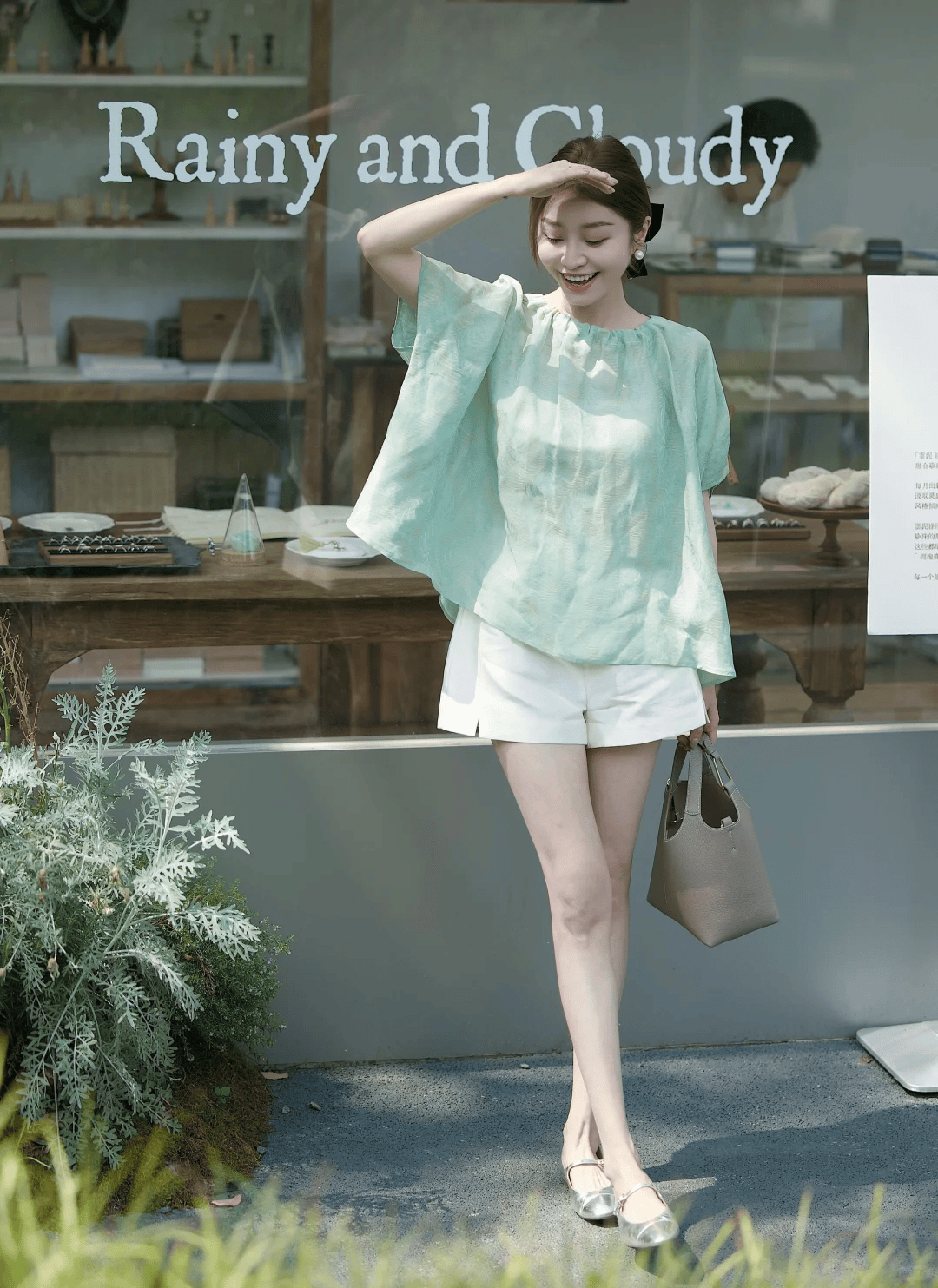初夏想要穿出松弛感,棉麻单品一定不能少。浅绿色棉麻罩衫宽松透气,自带慵懒随性的气质,搭配白色A字短裤,巧妙修饰身形,清爽又藏肉。再配上一双简约凉鞋,整体清新干净,温柔又减龄,轻松打造夏日治愈系氛围感。