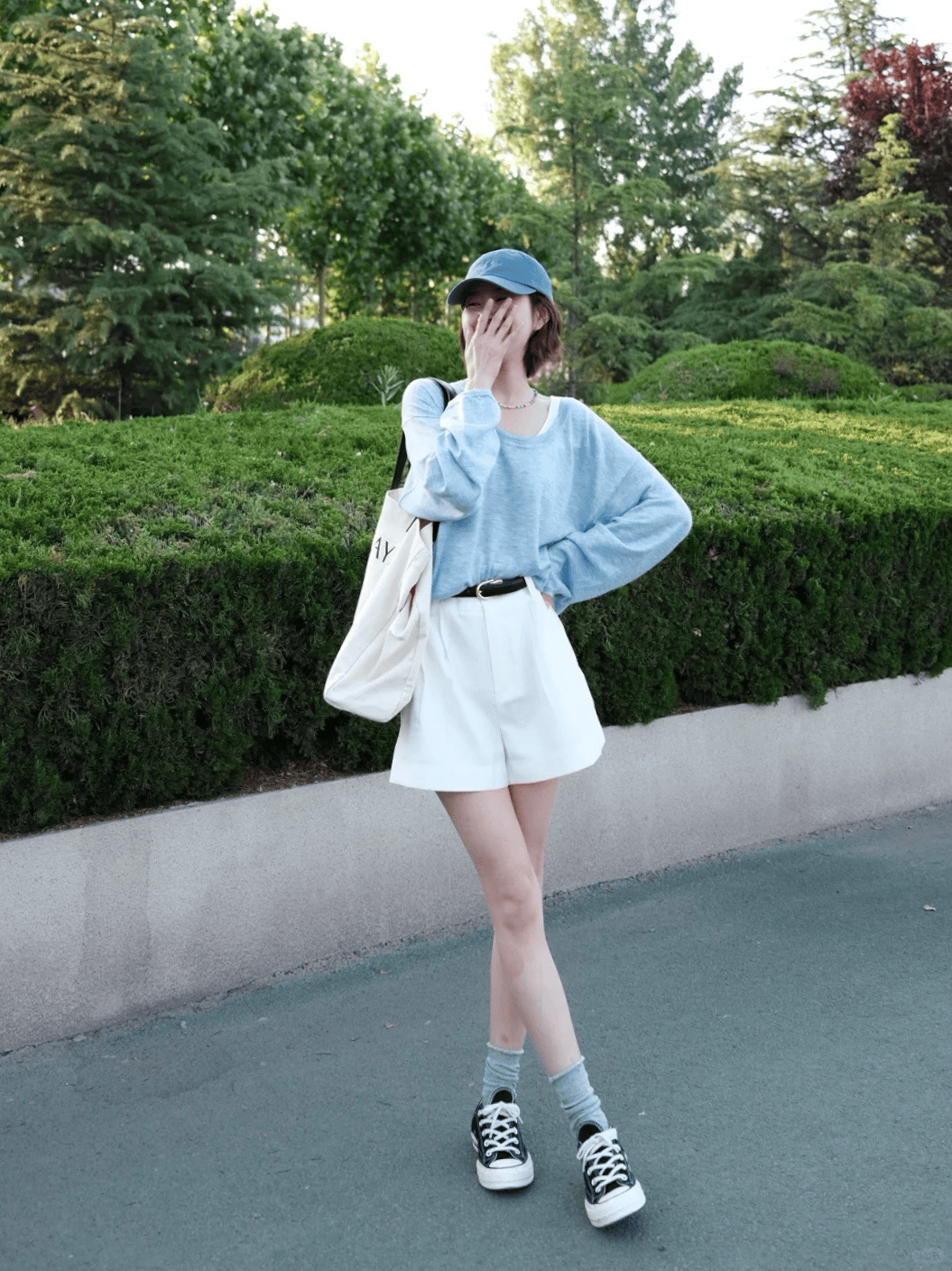 浅蓝色长袖衫搭配白色A字西装短裤,清爽又显利落。腰间系一条黑色腰带勾勒腰线,瞬间提升比例与精致感。脚踩经典黑色帆布鞋,休闲随性不挑人,再配上米白色帆布包,整体简约耐看,松弛又时髦,日常出街超有范儿。