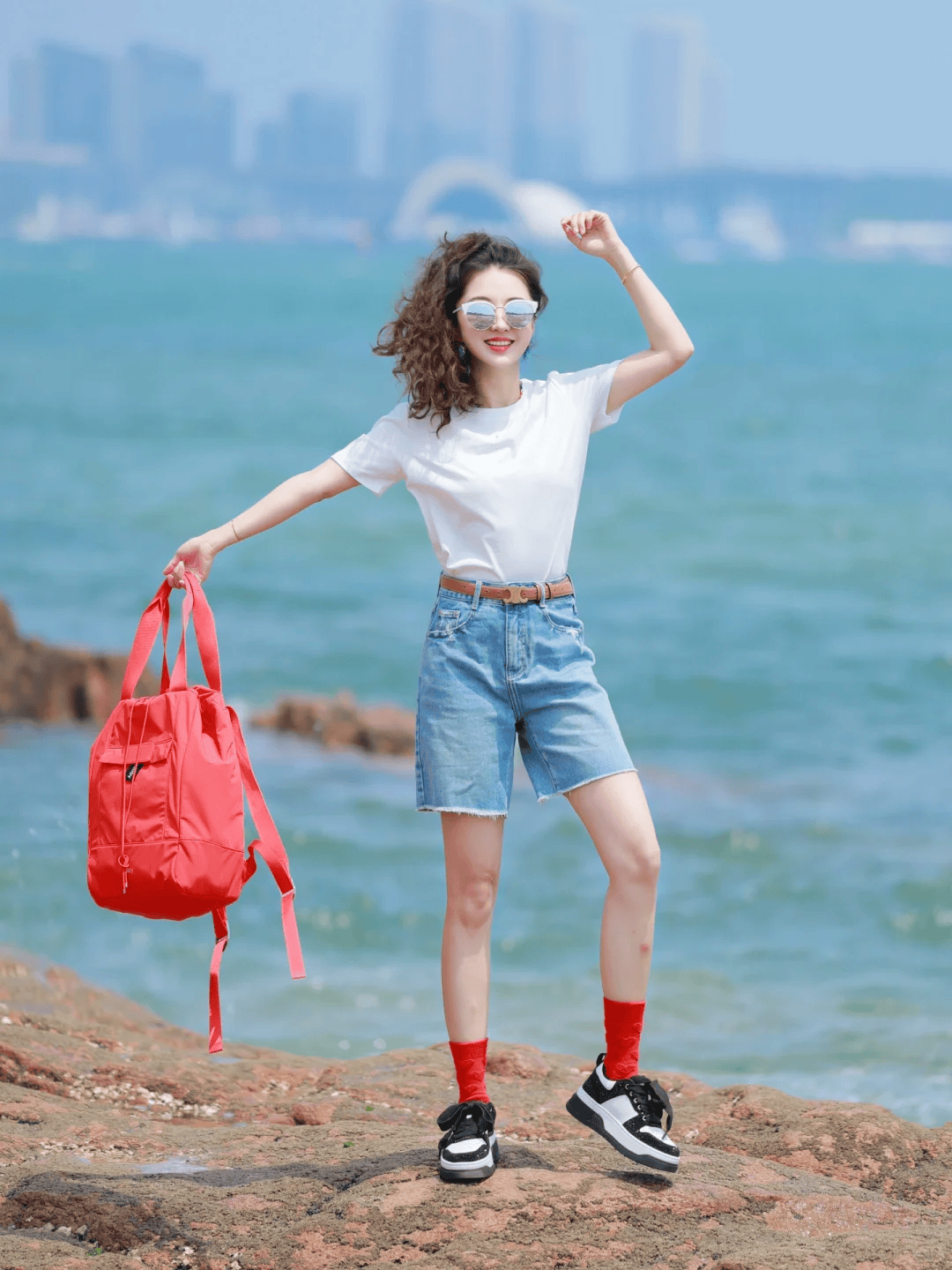 而对于偏瘦的身材,就要注意牛仔短裤的廓形,像这种常规的四分短裤,版型宽松恰到好处,将T恤下摆塞进裤腰,可以更好的突显身材线条感,搭配简单的黑白拼色运动鞋,就可以轻松打造初夏氛围感穿搭。