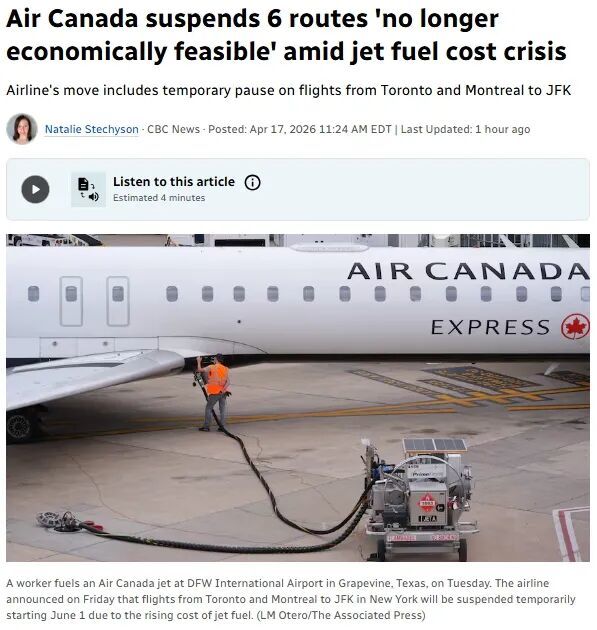 由于油价暴涨,加航刚刚宣布暂停六条“不再具有经济可行性”的航线。其中包括从多伦多和蒙特利尔飞往纽约肯尼迪国际机场的航班。这些临时停飞将从2026年5月底至8月陆续生效,部分航线计划在2027年恢复。受影响的乘客将获得替代出行方案,此次调整约占加航年度运力的1%。