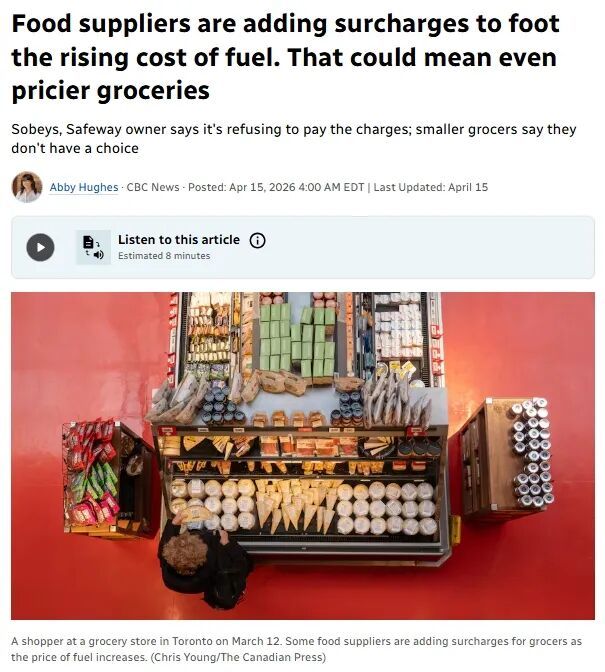 近日,加拿大四大食品供应商悄悄向各大连锁超市发出通知,宣布将在配送费用中加收燃油附加费。而这笔钱,最终很可能转嫁到消费者的购物车里。