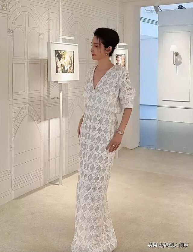 此次亮相NAERSI秀场,李冰冰特意选了一身白色菱格纹V领连身长裙,垂坠感十足的裙摆自带高级感。