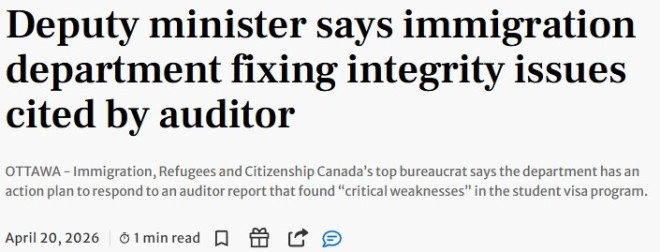加拿大移民、难民及公民部(IRCC)副部长 Ted Gallivan 日前表示,部门正加紧修补学签项目的监管漏洞,并承诺将在 2026 年底前全面落实整改计划。