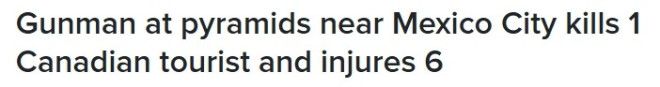 4 月 20 日,墨西哥首都墨西哥城以北约一小时车程的特奥蒂瓦坎金字塔景区突发枪击事件。墨西哥政府证实,一名持枪男子在景区内开火,造成 1 名加拿大游客死亡,6 人受伤。