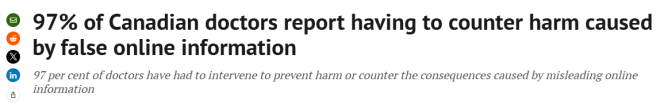据《国家邮报》4 月 21 日报道,加拿大医学会委托 Abacus Data 进行的一项新调查显示,97% 的医生表示,他们不得不采取措施防止或纠正因误导性网络信息(包括人工智能生成的建议)带来的伤害。