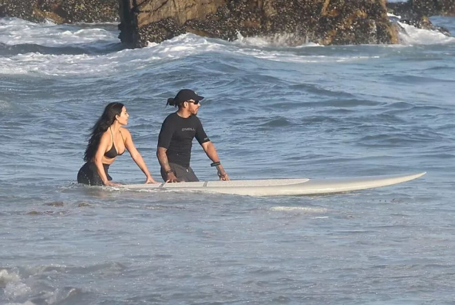 两人在海浪中不仅保持着眼神交流,还深情拥吻,外界普遍认为这段感情正迅速升温。在这次户外运动中,两人也展示了各自的冲浪技巧。卡戴珊在汉密尔顿的注视下跃上冲浪板,两人相互依偎,在乘风破浪时显得格外默契与放松。