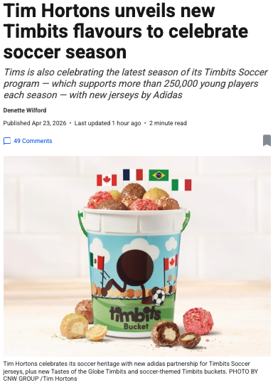 除了新品,Tim Hortons还同步庆祝其“Timbits Soccer”青少年足球项目的新赛季。该项目每年支持超过25万名儿童参与,今年还将与Adidas合作推出全新球衣。