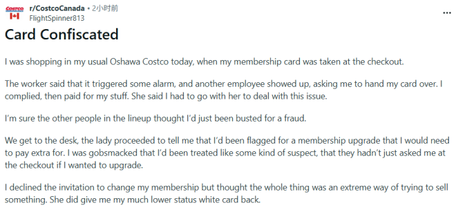 据这位顾客描述,他当时正在Oshawa的一家Costco正常结账,收银员突然“扣下”了他的会员卡,并告知系统触发了“警报”。