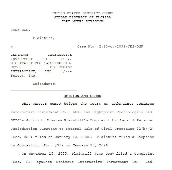 这份由美国佛罗里达州中区地方法院迈尔斯堡分院于2026年2月签署的裁定文件显示,一名27岁的佛罗里达州女性指控遭到名为Hongda Lu的中国公民强奸,并指出Hongda Lu是Genimous Technology Co., Ltd.的董事长。