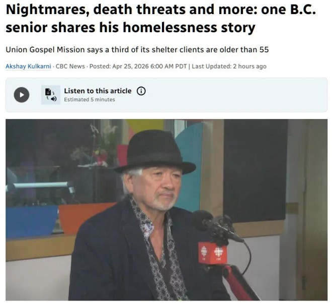 他指出,根据 2025 年大温地区无家可归者统计,47% 的无家可归老年人表示,这是他们作为老年人第一次经历无家可归的境况。