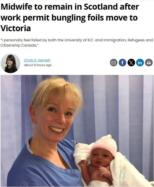 一名在BC省工作的苏格兰助产士表示,尽管BC省大力招募医护人员,但她工作许可的限制仍未得到彻底解决,因此她不会从苏格兰返回维多利亚。她表示对整个过程感到失望,觉得被系统“辜负”。