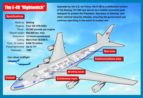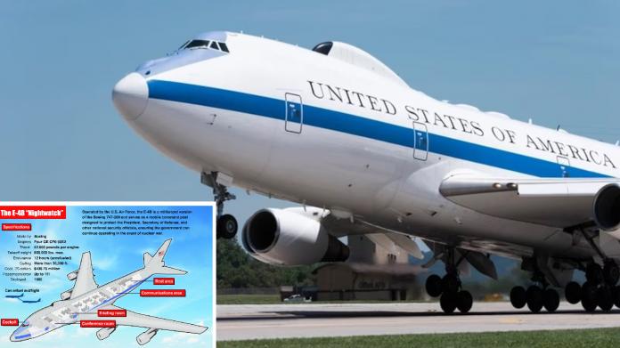 E-4B预警机俗称“末日飞机”(Doomsday Plane),根据美国空军资料,该机又称“夜视者”(Nightwatch),是一款军用的波音747飞机,可在国家紧急状态下作为美国总统和军队的国家指挥中心。当搭载总统时,被称为“空军一号”(Air Force One)。