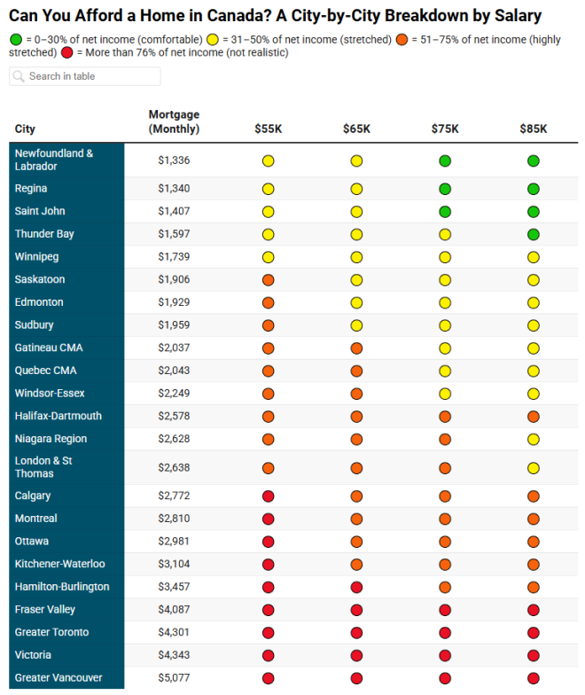 这份报告是这么算的:先看各个城市的平均房价,在房价较低的市场统一按10万首付来算,而房价较高的市场则按20%首付。再根据当前利率环境,算出每月房贷,然后拿去对比不同收入水平(55K、65K、75K、85K)的税后收入,看看压力到底有多大。